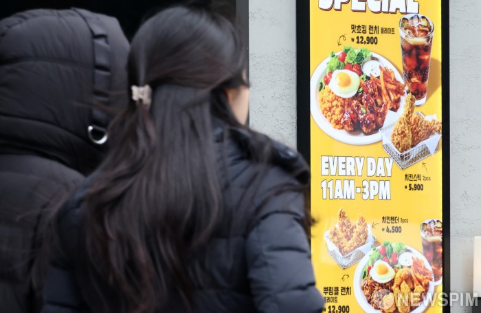 [서울=뉴스핌] 최지환 기자 = 정부가 상위 10대 치킨 프랜차이즈를 대상으로 매장 및 배달 주문 메뉴판에 조리 전 닭고기 무게를 고지해야 되는 '치킨 중량표시제'를 실시한 15일 서울 시내의 한 치킨매장 앞으로 시민들이 오가고 있다. 2025.12.15 choipix16@newspim.com