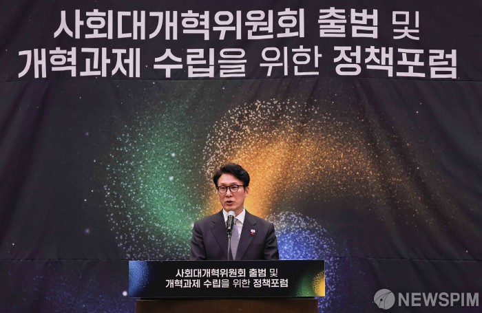[서울=뉴스핌] 윤창빈 기자 = 김민석 국무총리가 15일 서울 여의도 국회 박물관에서 열린 사회대개혁위원회 출범 및 개혁과제 수립을 위한 정책포럼에서 축사를 하고 있다. 2025.12.15 pangbin@newspim.com