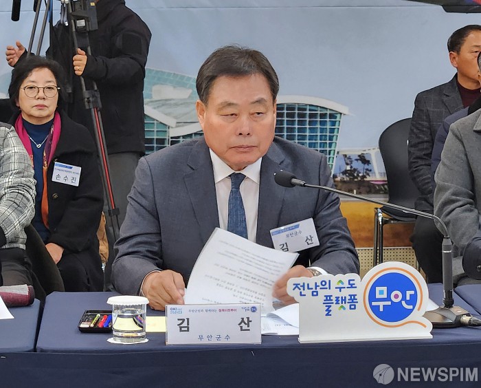 [무안=뉴스핌] 조은정 기자 = 김산 무안군수가 15일 무안군 승달문화예술회관 전시실에서 열린 '2025무안군 정책비전 투어' 행사에서 환영사를 하고 있다. 2025.12.15 ej7648@newspim.com