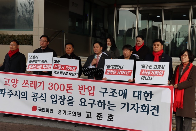 [수원=뉴스핌] 박승봉 기자 = 경기도의회 고준호 의원(파주1·국민의힘)은 15일 오후 2시 파주시청 본관 앞에서 기자회견을 열고, 파주시가 추진 중인 소각시설 사업과 관련해 고양시 생활폐기물 하루 300톤 반입 가능성이 포함된 '700톤 규모 광역 소각장' 추진 정황에 대해 파주시에 명확한 공식 입장을 요구했다.
