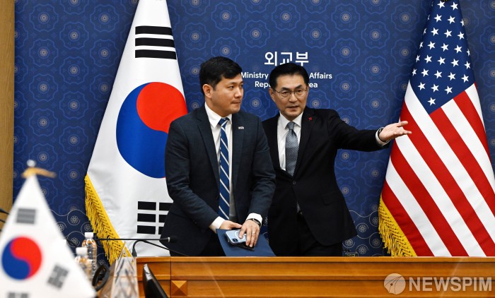 [서울=뉴스핌] 이길동 기자 = 정연두 외교전략정보본부장(오른쪽)이 16일 오전 서울 종로구 정부서울청사 별관에서 열린 한미 정상회담 'Joint Fact Sheet' 후속 협의에서 케빈킴 주한미국대사대리의 자리를 안내하고 있다. 2025.12.16 gdlee@newspim.com