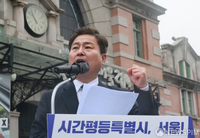 [서울=뉴스핌] 김학선 기자 = 김영배 더불어민주당 의원이 16일 서울 중구 옛 서울역사(문화역서울284) 앞에서 서울시장 선거 출마를 선언하고 있다. 2025.12.16 yooksa@newspim.com