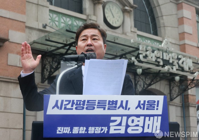 [서울=뉴스핌] 김학선 기자 = 김영배 더불어민주당 의원이 16일 서울 중구 옛 서울역사(문화역서울284) 앞에서 서울시장 선거 출마를 선언하고 있다. 2025.12.16 yooksa@newspim.com