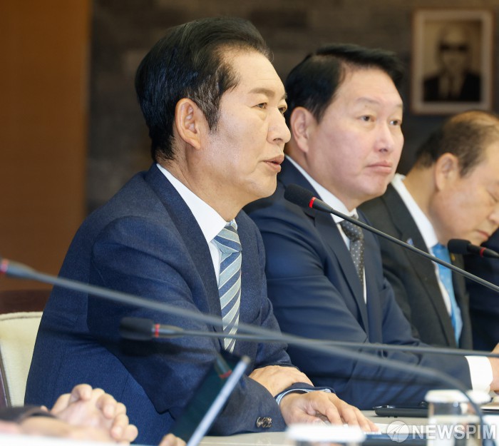 [서울=뉴스핌] 류기찬 기자 = 정청래 더불어민주당 대표가 16일 오전 서울 중구 대한상공회의소에 열린 ‘더불어민주당-대한상공회의소 정책간담회’에서 인사말을 하고 있다. 2025.12.16 ryuchan0925@newspim.com