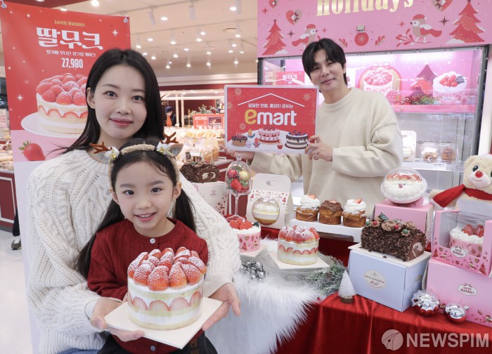[서울=뉴스핌] 16일 서울 용산구 이마트 용산점에서 모델들이 신세계푸드의 겨울 딸기 홀케이크를 선보이고 있다. 겨울 딸기를 듬뿍 올린 시즌 한정 케이크는 전국 이마트 내 베이커리 매장인 '블랑제리'와 'E베이커리'를 통해 판매된다. [사진=이마트] 2025.12.16 photo@newspim.com