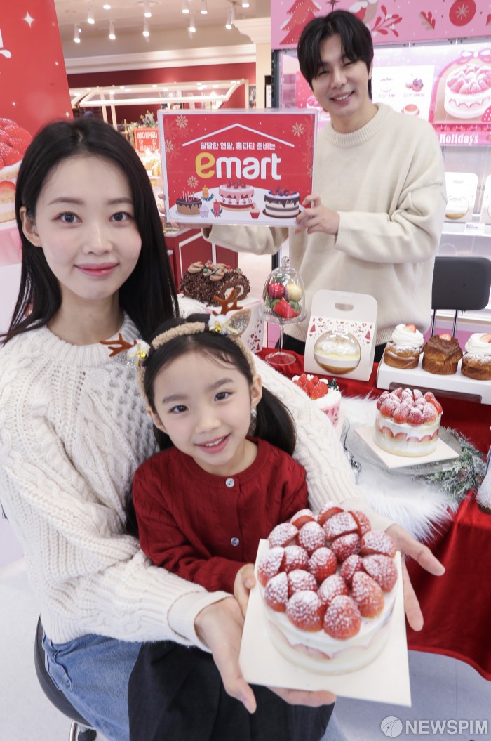 [서울=뉴스핌] 16일 서울 용산구 이마트 용산점에서 모델들이 신세계푸드의 겨울 딸기 홀케이크를 선보이고 있다. 겨울 딸기를 듬뿍 올린 시즌 한정 케이크는 전국 이마트 내 베이커리 매장인 '블랑제리'와 'E베이커리'를 통해 판매된다. [사진=이마트] 2025.12.16 photo@newspim.com