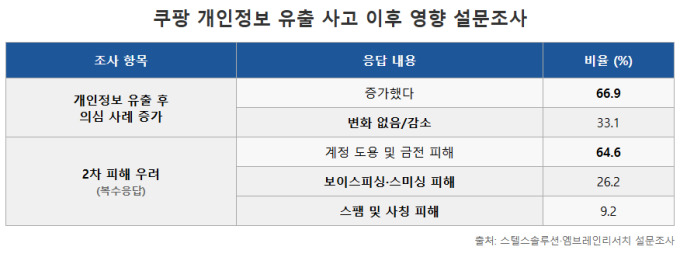 글로벌 사이버 보안 기업 스텔스솔루션이 엠브레인리서치에 의뢰해 실시한 설문조사에 따르면 응답자의 66.9%는 "쿠팡 개인정보 유출 사고 이후 계정 도용이나 피싱, 스팸으로 의심되는 사례가 늘었다"고 답했다. 개인정보 유출에 따른 2차 피해 우려로는 '계정 도용 및 금전 피해'가 64.6%로 가장 높았고, '보이스피싱·스미싱 피해'(26.2%), '스팸 및 사칭 피해'(9.2%)가 뒤를 이었다.