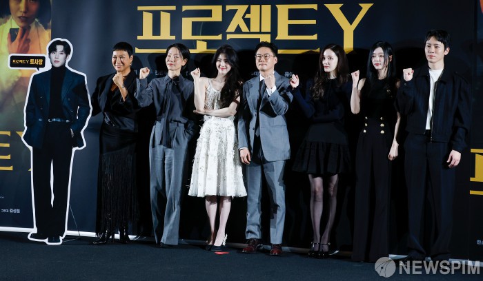 [서울=뉴스핌] 류기찬 기자 = 이환 감독(왼쪽 네번째)과 배우 한소희, 전종서 등 출연진들이 16일 오후 서울 강남구 메가박스 코엑스에서 열린 ‘프로젝트Y 제작보고회’에서 포즈를 취하고 있다. 프로젝트Y는 화려한 도시 그 한가운데에서 다른 내일을 꿈꾸며 살아가던 미선(한소희)과 도경(전종서)이 인생의 벼랑 끝에서 검은 돈과 금괴를 훔치면서 벌어지는 이야기를 그린 작품이다. 내년 1월 21일 개봉. 2025.12.16 ryuchan0925@newspim.com