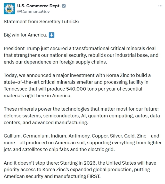러트닉 장관은 또 "이 최첨단 프로젝트에 대한 투자를 통해 우리는 핵심광물을 대량으로 (미국)국내에서 생산함으로써 외국 국가에 대한 의존도를 낮추고, 국가안보와 경제안보를 단호하게 강화하게 된다"며 "구체적으로 미국은 고려아연의 생산 확대분 중 일부에 대해 우선적 매수권한(preferred access)을 갖게 된다"고 덧붙였다.