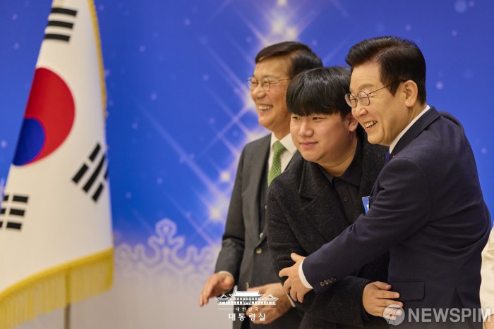 [서울=뉴스핌] 이재명 대통령이 16일 서울 용산 대통령실에서 열린 2025년 기부·나눔단체 초청행사에서 이창준 초록우산 인재양성 아동과 포옹을 하고 있다. [사진=대통령실] 2025.12.16 photo@newspim.com3