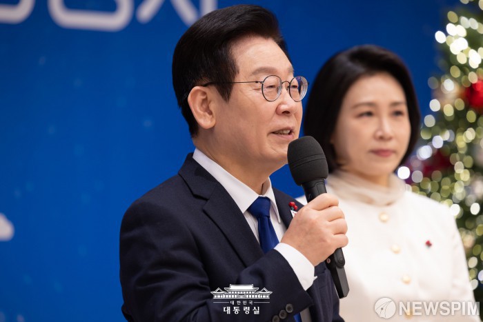 [서울=뉴스핌] 이재명 대통령이 16일 서울 용산 대통령실에서 열린 2025년 기부·나눔단체 초청행사에서 인사말을 하고 있다. [사진=대통령실] 2025.12.16 photo@newspim.com