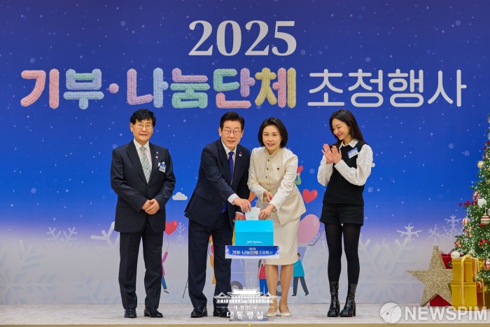 [서울=뉴스핌] 이재명 대통령과 김혜경 여사가 16일 서울 용산 대통령실에서 열린 2025년 기부·나눔단체 초청행사에서 한국해비타트에 성금을 전달하고 있다. [사진=대통령실] 2025.12.16 photo@newspim.com