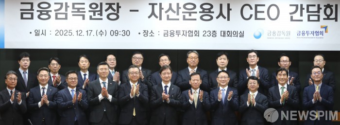 [서울=뉴스핌] 이형석 기자 = 이찬진 금융감독원장(앞줄 왼쪽 여섯번째)을 비롯한 참석자들이 17일 오전 서울 여의도 금융투자협회에서 열린 금융감독원장 - 자산운용사 CEO 간담회에서 기념촬영을 하고 있다. 2025.12.17 leehs@newspim.com