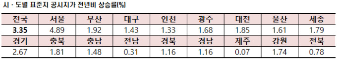 전국 표준지 공시지가는 올해 대비 3.35% 상승한 것으로 조사됐으며 시·도별로는 ▲서울 4.89% ▲경기 2.67% ▲부산 1.92% ▲대전 1.85% ▲충북 1.81% 순으로 변동한 것으로 나타났다.
