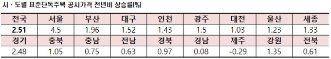내년 전국 표준주택 공시가격안에 따르면 2025년 대비 2.51% 상승했다. 시·도별로는 ▲서울 4.50% ▲경기 2.48% ▲부산 1.96% ▲대구 1.52% ▲광주 1.50% 순으로 변동했다.