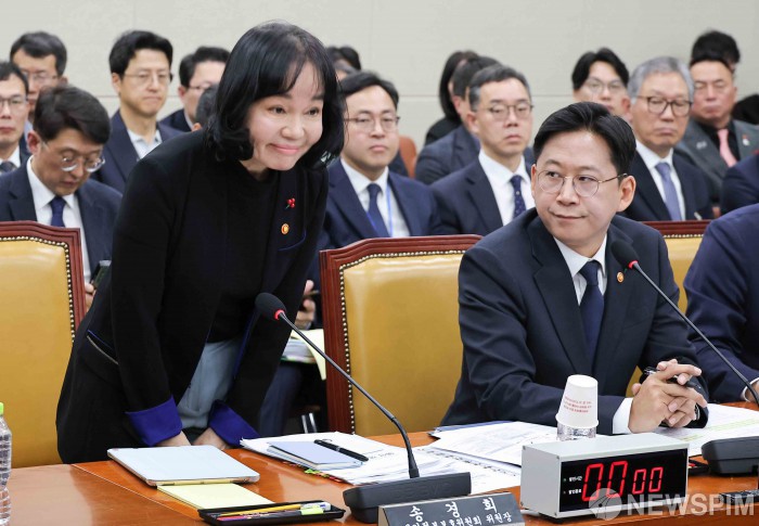 [서울=뉴스핌] 윤창빈 기자 = 송경희 개인정보보호위원장이 17일 서울 여의도 국회 과학기술정보방송통신위원회에서 열린 쿠팡 침해사고 관련 청문회에서 인사를 하고 있다. 2025.12.17 pangbin@newspim.com