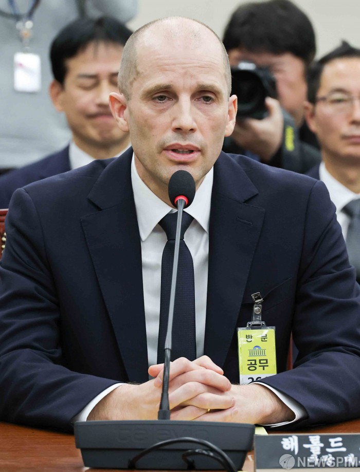 [서울=뉴스핌] 윤창빈 기자 = 헤롤드 로저스 쿠팡 대표가 17일 서울 여의도 국회 과학기술정보방송통신위원회에서 열린 쿠팡 침해사고 관련 청문회에서 의원 질문에 답변하고 있다. 2025.12.17 pangbin@newspim.com