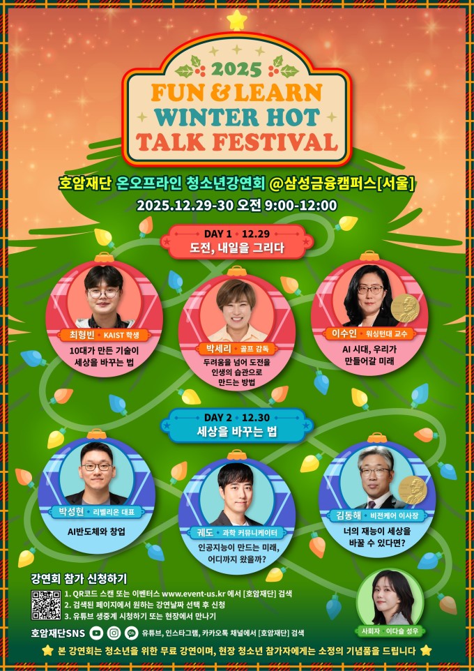 [서울=뉴스핌] 김아영 기자 = 호암재단은 오는 29일부터 30일까지 이틀간 서울 서초구 삼성금융캠퍼스에서 청소년 강연 프로그램 '펀앤런, 2025 윈터 핫 톡 페스티벌(Fun & Learn, 2025 Winter Hot Talk Festival)'을 개최한다고 17일 밝혔다. 이번 행사는 현장과 온라인을 병행해 진행된다.