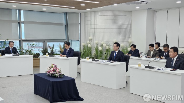 [무안=뉴스핌] 조은정 기자 = 17일 오전 광주 서구 치평동 광주도시공사 중회의에서 광주 민간·군 공항 통합 이전을 위한 6자 협의체 첫 회의가 열리고 있다. 참석자는 김용범 대통령실 정책실장, 구윤철 기획재정부 장관, 안규백 국방부 장관, 강희업 국토교통부 2차관, 강기정 광주시장, 김영록 전남지사, 김산 무안군수. 2025.12.17 ej7648@newspim.com