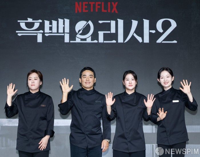 [서울=뉴스핌] 류기찬 기자 = 윤주모 셰프(왼쪽부터), 프렌치 파파, 중식마녀, 아기맹수가 17일 오전 서울 종로구 JW 메리어트 동대문 스퀘어 서울에서 열린 넷플릭스 예능 ‘흑백요리사: 요리 계급전쟁2’ 기자간담회에서 포즈를 취하고 있다. '흑백요리사2'는 오직 맛으로 계급을 뒤집으려는 재야의 고수 '흑수저' 셰프들과 이를 지키려는 대한민국 최고 수준의 스타 셰프 '백수저'들이 펼치는 요리 서바이벌 예능이다. 2025.12.17 ryuchan0925@newspim.com