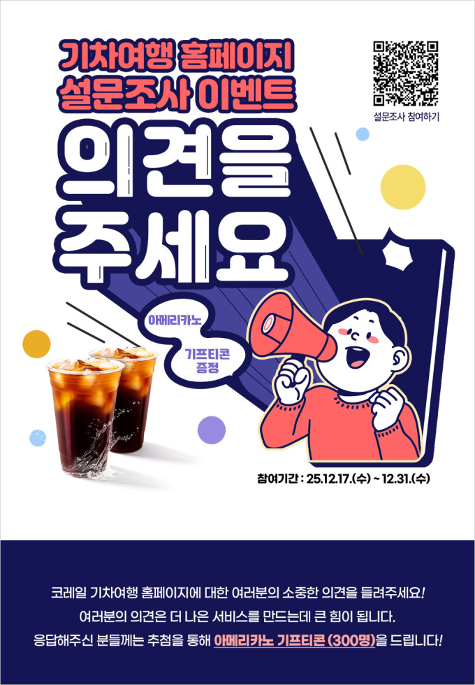 참여 고객 중 300명을 추첨해 커피 기프티콘을 제공할 예정이다. 코레일은 접수된 의견을 향후 서비스 개선에 반영할 계획이다.