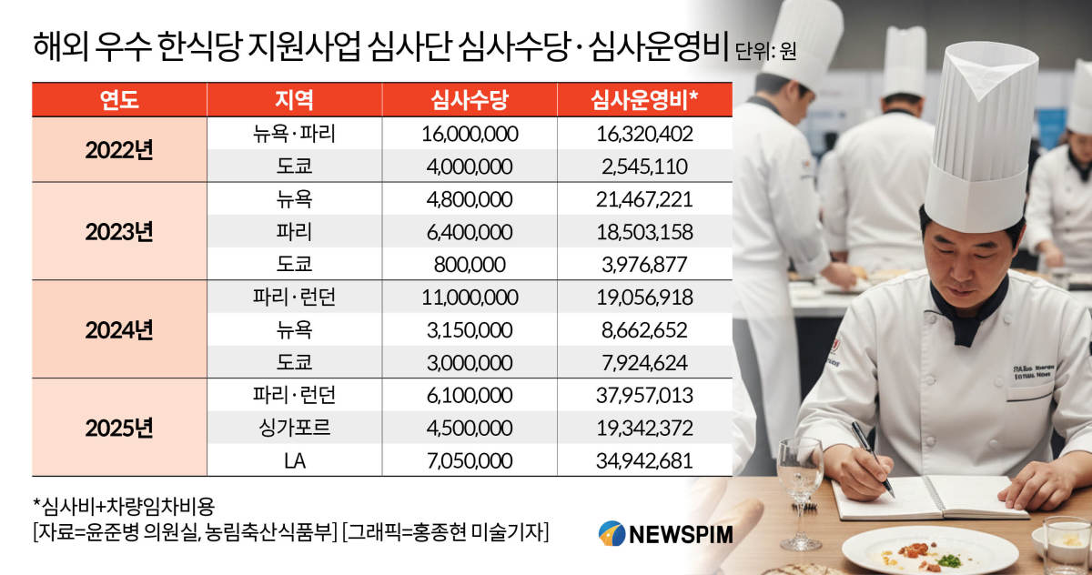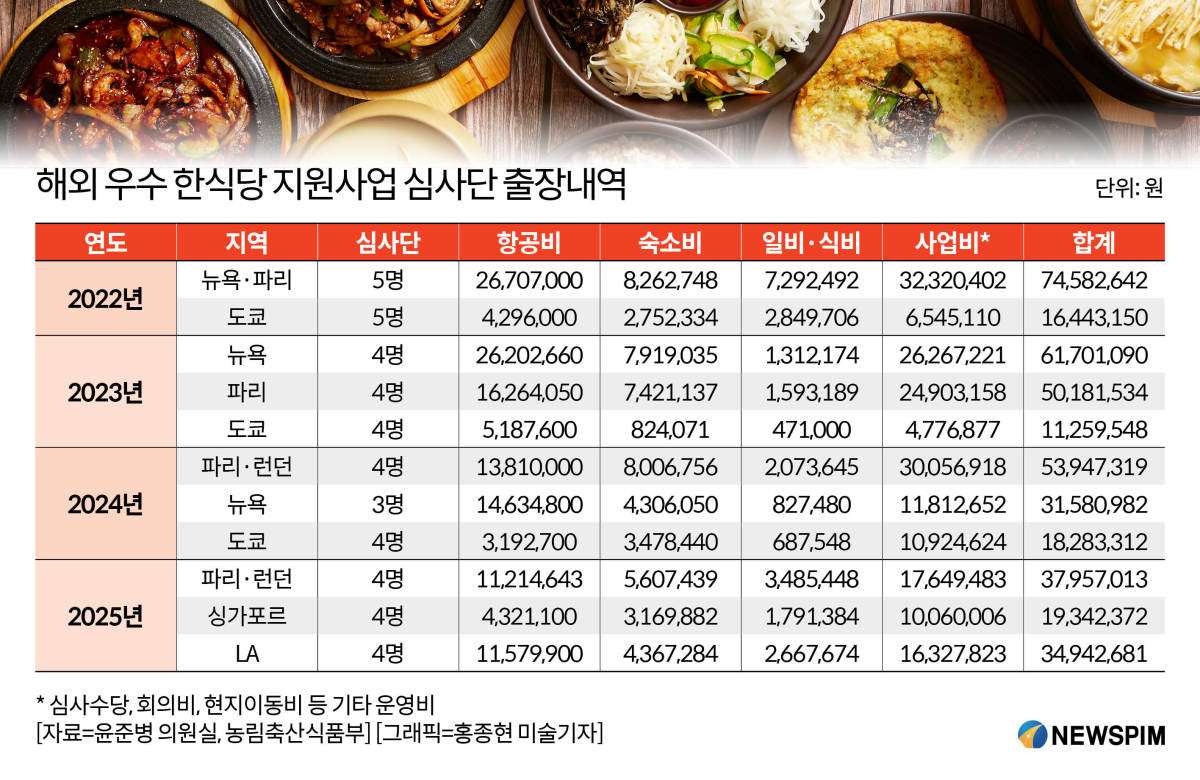 21일 <뉴스핌>이 국회 농림축산식품해양수산위원회 소속 윤준병 더불어민주당 의원실로부터 제공받은 자료에 따르면, 농식품부는 해외 우수 한식당 현장 심사를 위해 ▲2022년 9100만원 ▲2023년 1억2300만원 ▲2024년 1억300만원 ▲2025년 9200만원 등 총 4억원가량의 출장비를 집행했다.