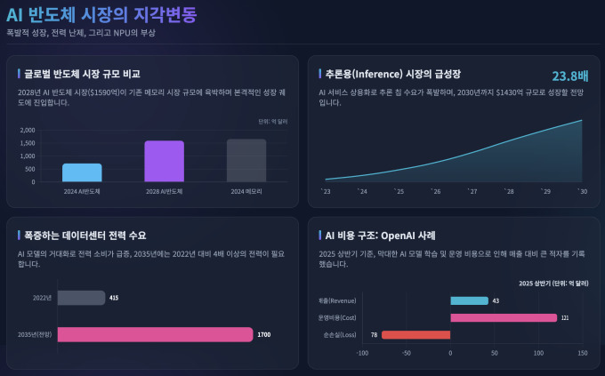 국제에너지기구(IEA)에 따르면 세계 데이터센터 전력수요는 2022년 415TWh에서 2035년 최대 1700TWh로 증가할 전망이다. 오픈AI는 2025년 상반기 매출 43억 달러를 기록했지만 운용비용이 121억 달러에 달해 78억 달러의 손실을 기록했다.