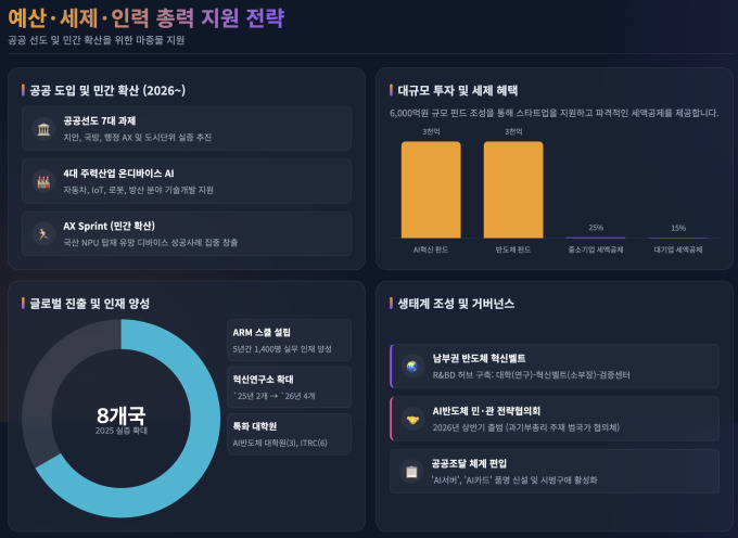 인재 육성도 강화한다. AI반도체 혁신연구소를 2025년 2개에서 2026년 4개로 확대하고, AI반도체 대학원 3개, ITRC(AI반도체) 6개 등 특화 대학원과 연구 거점을 운영한다. 정부-ARM MoU를 바탕으로 '(가칭)ARM 스쿨'을 설립해 5년간 1400명을 교육하며, 학·석사 연계 교육과정을 운영한다. 기업-대학 공동 교육 프로그램을 통해 현장 중심의 실무형 인재를 양성하고 취업을 연계해 팹리스 인력난 해소를 지원한다.