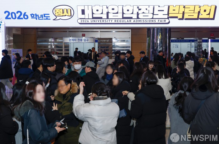 [서울=뉴스핌] 류기찬 기자 = 18일 오전 서울 강남구 코엑스에서 열린 '2026학년도 정시 대학입학정보박람회'를 찾은 수험생과 학부모들이 입장을 위해 대기하고 있다. 2025.12.18 ryuchan0925@newspim.com