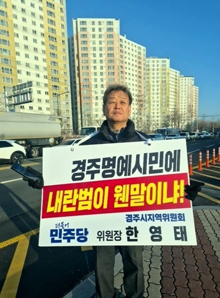 '12·3 불법계엄' 관련 기소된 인물 등에게 경주시가 '명예시민증'을 수여하는 내용이 담긴 안건이 18일 경주시의회를 통과하자 한영태 민주당 경주시지역위원장이 피켓시위를 펼치며 항의하고 있다.[사진=민주당경주시지역위] 2025.12.18 nulcheon@newspim.com