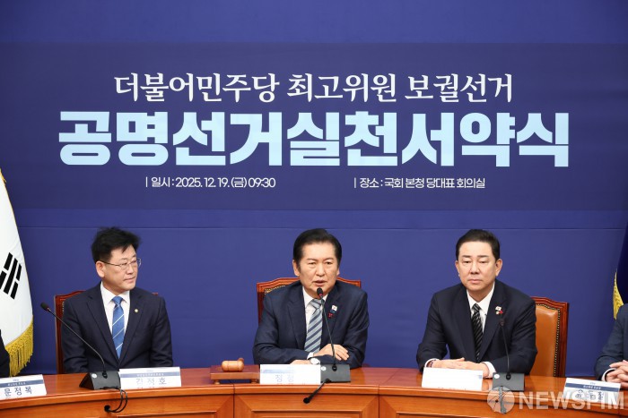 [서울=뉴스핌] 최지환 기자 = 정청래 더불어민주당 대표가 19일 오전 서울 여의도 국회에서 열린 공명선거 실천 서약식에서 발언하고 있다. 2025.12.19 choipix16@newspim.com
