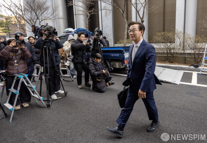 [서울=뉴스핌] 이길동 기자 = 통일교로부터 금품 수수 의혹을 받고 해양수산부 장관직을 내려놓은 전재수 더불어민주당 의원이 19일 오전 서울 서대문구 경찰청에 피의자 신분으로 출석하고 있다. 전 의원은 2018년 무렵 통일교 측으로부터 현금 2000만원과 1000만원 상당의 고가 시계를 수수한 혐의 등을 받고 있다. 2025.12.19 gdlee@newspim.com