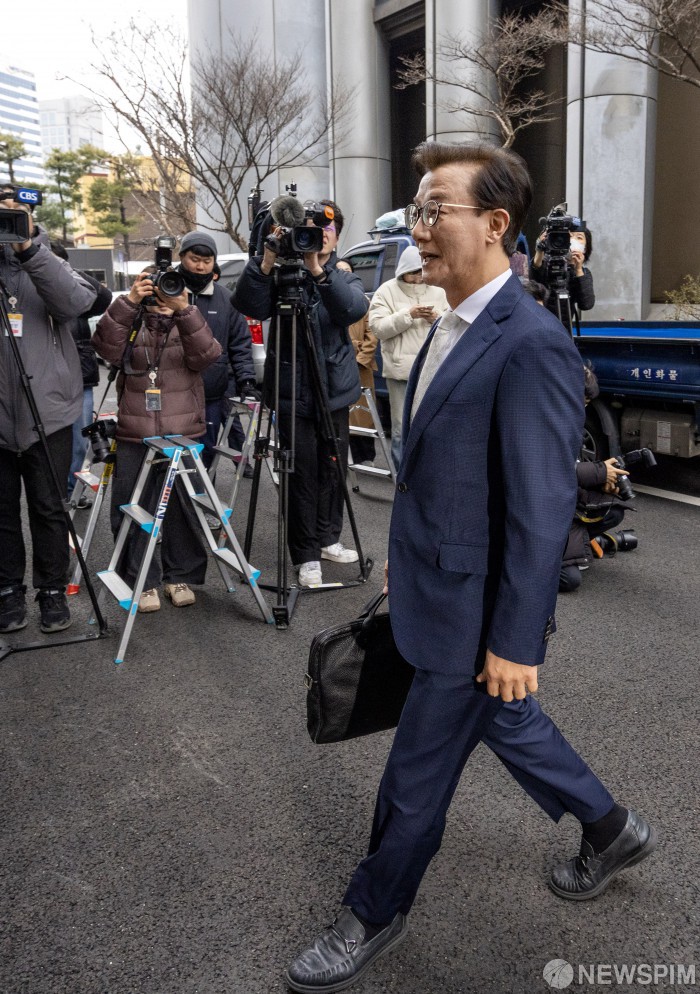 [서울=뉴스핌] 이길동 기자 = 통일교로부터 금품 수수 의혹을 받고 해양수산부 장관직을 내려놓은 전재수 더불어민주당 의원이 19일 오전 서울 서대문구 경찰청에 피의자 신분으로 출석하고 있다. 전 의원은 2018년 무렵 통일교 측으로부터 현금 2000만원과 1000만원 상당의 고가 시계를 수수한 혐의 등을 받고 있다. 2025.12.19 gdlee@newspim.com