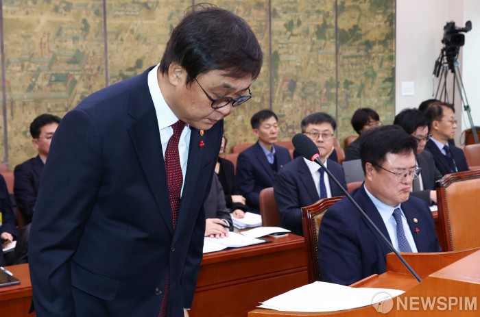 [서울=뉴스핌] 최지환 기자 = 최휘영 문화체육관광부 장관이 19일 오전 서울 여의도 국회에서 열린 문화체육관광위원회 전체회의에서 의원들에게 고개 숙여 인사하고 있다. 2025.12.19 choipix16@newspim.com