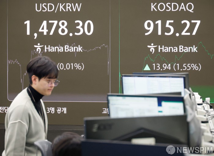 [서울=뉴스핌] 류기찬 기자 = 19일 오후 서울 중구 하나은행 딜링룸 전광판에 달러/원, 코스닥 지수가 표시되고 있다. 이날 코스피 지수는 전 거래일 대비 26.04포인트(0.65%) 오른 4020.55에, 달러/원 환율은 2.0원 내린 1476.30원에, 코스닥 지수는 13.94포인트(1.55%) 오른 915.27에 장을 마감했다. 2025.12.19 ryuchan0925@newspim.com