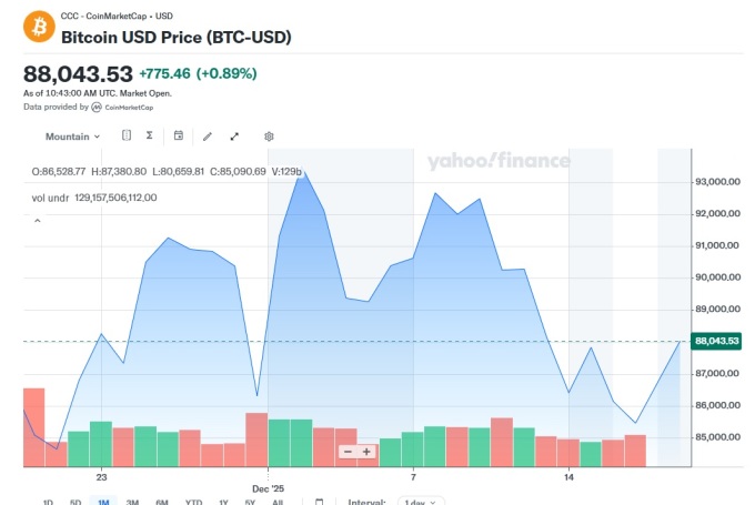 [서울=뉴스핌] 고인원 기자= 비트코인 가격은 19일 일본은행(BOJ)의 기준금리 인상 이후 오히려 상승하며 8만8000달러선을 회복했다. 일본의 30년 만의 금리 인상이 글로벌 금융시장의 충격 요인으로 작용할 수 있다는 우려와 달리, 엔화 약세와 위험선호 회복이 맞물리며 암호화폐 시장에는 안도감이 확산됐다.