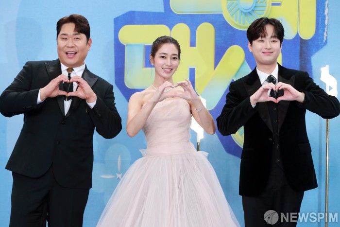 [서울=뉴스핌] 이형석 기자 = 방송인 문세윤, 이민정, 이찬원이 20일 오후 서울 여의도 KBS에서 열린 연예대상 시상식 포토월에서 포즈를 취하고 있다. 2025.12.20 leehs@newspim.com