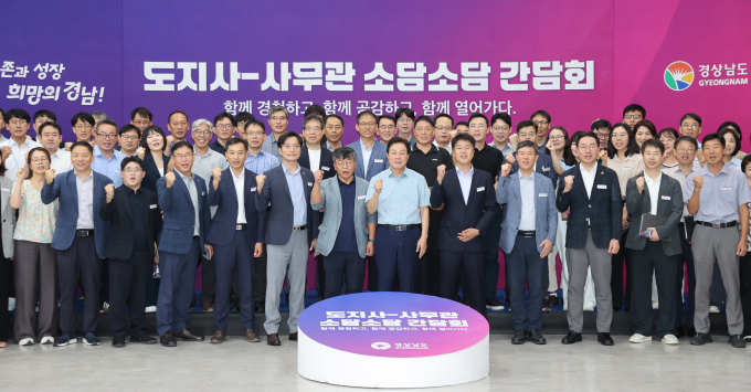 경남도지사-사무관 소담소담간담회에서 참석자들이 화이팅을 외치며 기념사진을 찍고 있다. [사진=경남도] 2025.12.21