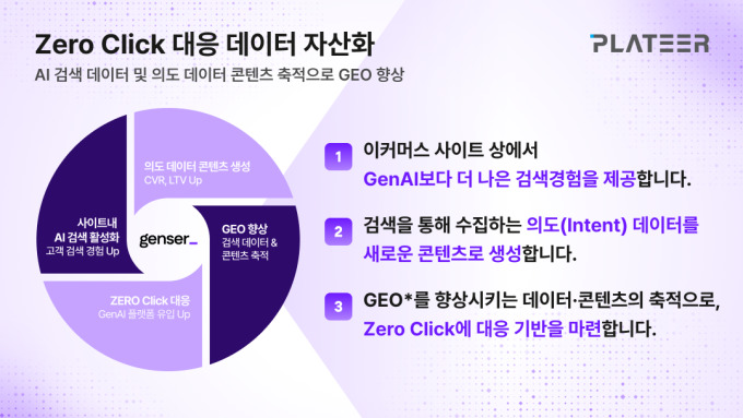 [서울=뉴스핌] 이나영 기자= AI·DX 솔루션 전문기업 플래티어는 자사의 SaaS형 AI 검색 솔루션 'genser(젠서)'를 통해 이커머스 기업의 새로운 생존 전략인 'GEO(생성형 엔진 최적화)' 전략 실행을 본격화한다고 22일 밝혔다.