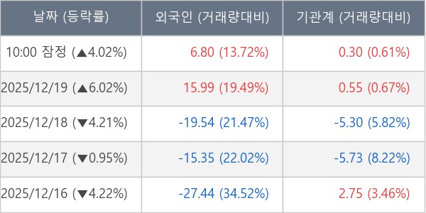 [서울=뉴스핌] 로보뉴스 = 22일 10시 15분 현재 한화엔진(082740)은 외국인과 기관이 각각 6.80 만 주, 0.30 만 주 순매수(잠정) 하면서 전일 대비 4.02% (현재가 43,950원) 상승하고 있다.