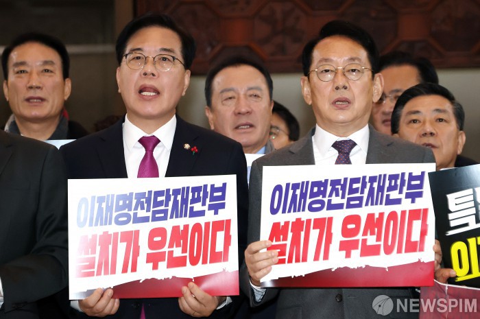 [서울=뉴스핌] 정일구 기자 = 송언석 국민의힘 원내대표와 김도읍 정책위의장 등 당 소속 의원들이 22일 오전 서울 여의도 국회 로텐더홀에서 열린 이재명 정권 사법부파괴-국민입틀막 악법 규탄대회에서 구호를 외치고 있다. 2025.12.22 mironj19@newspim.com