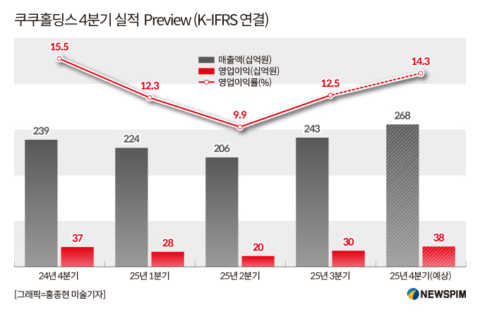 쿠쿠홀딩스는 올해 3분기 연결 기준 매출액 2433억원, 영업이익 303억원을 기록했다. 증권가는 4분기에도 실적 개선 흐름이 이어질 것으로 보고 있다. 올 4분기 연결 기준 매출액과 영업이익은 각각 2682억원, 382억원으로 추정됐다.