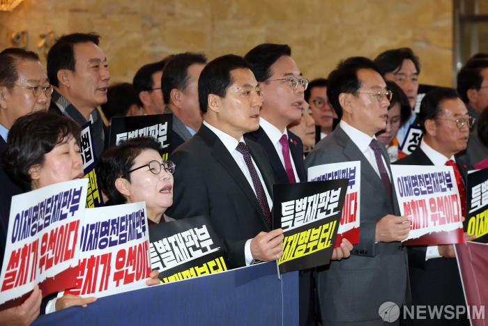 [서울=뉴스핌] 정일구 기자 = 송언석 국민의힘 원내대표와 김도읍 정책위의장 등 당 소속 의원들이 22일 오전 서울 여의도 국회 로텐더홀에서 열린 이재명 정권 사법부파괴-국민입틀막 악법 규탄대회에서 구호를 외치고 있다. 2025.12.22 mironj19@newspim.com