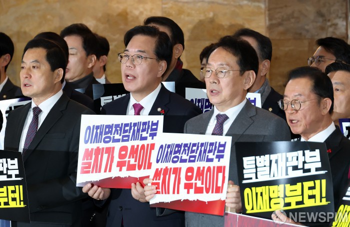 [서울=뉴스핌] 정일구 기자 = 송언석 국민의힘 원내대표와 김도읍 정책위의장 등 당 소속 의원들이 22일 오전 서울 여의도 국회 로텐더홀에서 열린 이재명 정권 사법부파괴-국민입틀막 악법 규탄대회에서 구호를 외치고 있다. 2025.12.22 mironj19@newspim.com
