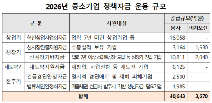 중기부는 기업 성장 단계에 맞춰 자금을 차등 지원할 계획이다. 업력 7년 미만 창업기업을 대상으로 한 '혁신창업 사업화자금'은 1조6000억원, 성장기 기업을 위한 '신시장진출 지원자금'과 '신성장 기반자금'은 1조7000억원 규모로 공급한다. 일시적 경영애로 기업을 지원하는 '긴급경영 안정자금'은 2500억원이 배정됐다.