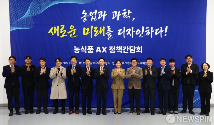 [서울=뉴스핌] 배경훈 부총리 겸 과학기술정보통신부 장관과 송미령 농림축산식품부 장관이 22일 오전 충청남도 천안시 연암대학교 그린테크 이노베이션 센터에서 열린 농식품 AX 정책간담회에서 기념촬영을 하고 있다. [사진=과학기술정보통신부] 2025.12.22 photo@newspim.com
