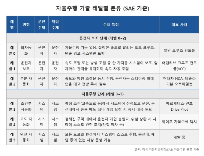 22일 업계에 따르면 자율주행 기술은 국제 표준으로 인정받는 미국 자동차공학회(SAE)의 분류 기준에 따라 레벨 0부터 레벨 5까지 총 6단계로 나뉜다. 각 단계는 '운전의 주체'가 누구인지, '돌발 상황에 대한 책임을 누가 지는지'에 따라 구분된다.