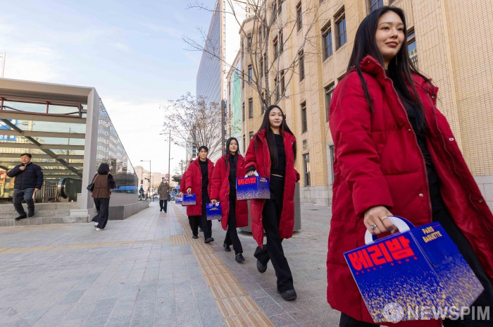 [서울=뉴스핌] 파리바게뜨가 크리스마스를 앞두고 22일 광화문 광장과 청계천 일대에서 홀리데이 케이크 '베리밤(BERRY BOMB)'을 주제로 '베리밤 런웨이(Runway, 패션쇼의 모델이 걷는 길)' 행사를 진행했다. [사진=파리바게뜨] 2025.12.22 photo@newspim.com