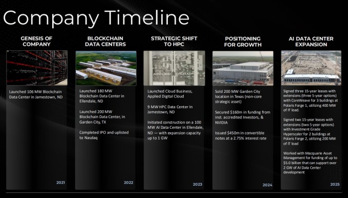 2001년 네바다주에 설립돼 텍사스주 댈러스에 본사를 두고 있는 어플라이드 디지털은 대규모 데이터센터를 구축해 마이크로소프트, 아마존 같은 클라우드 및 AI 기업에 임대하는 사업 모델을 영위하고 있다. 회사는 암호화폐 채굴 고객 대상 데이터센터 호스팅에서 시작해 AI 시장 급성장에 힘입어 사업을 본격 확장하고 있으며, 부동산투자신탁(REIT) 전환을 통한 새로운 성장 동력 확보도 추진 중이다.