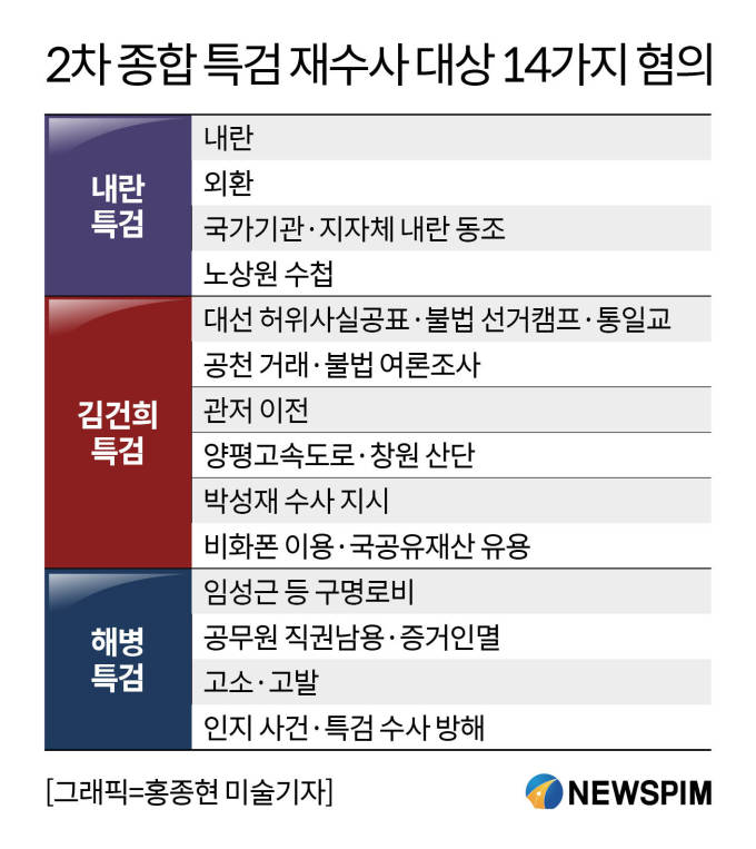 [서울=뉴스핌] 홍석희 기자 = 더불어민주당이 3대 특검(내란·김건희·해병) 활동 종료 후 남은 의혹을 추가로 수사할 2차 종합 특검법을 발의했다. 3대 특검의 핵심 수사대상이었으나 인력 한계 등으로 의혹 규명이 미비하다고 판단된 14개 혐의가 2차 특검의 수사대상에 포함됐다.